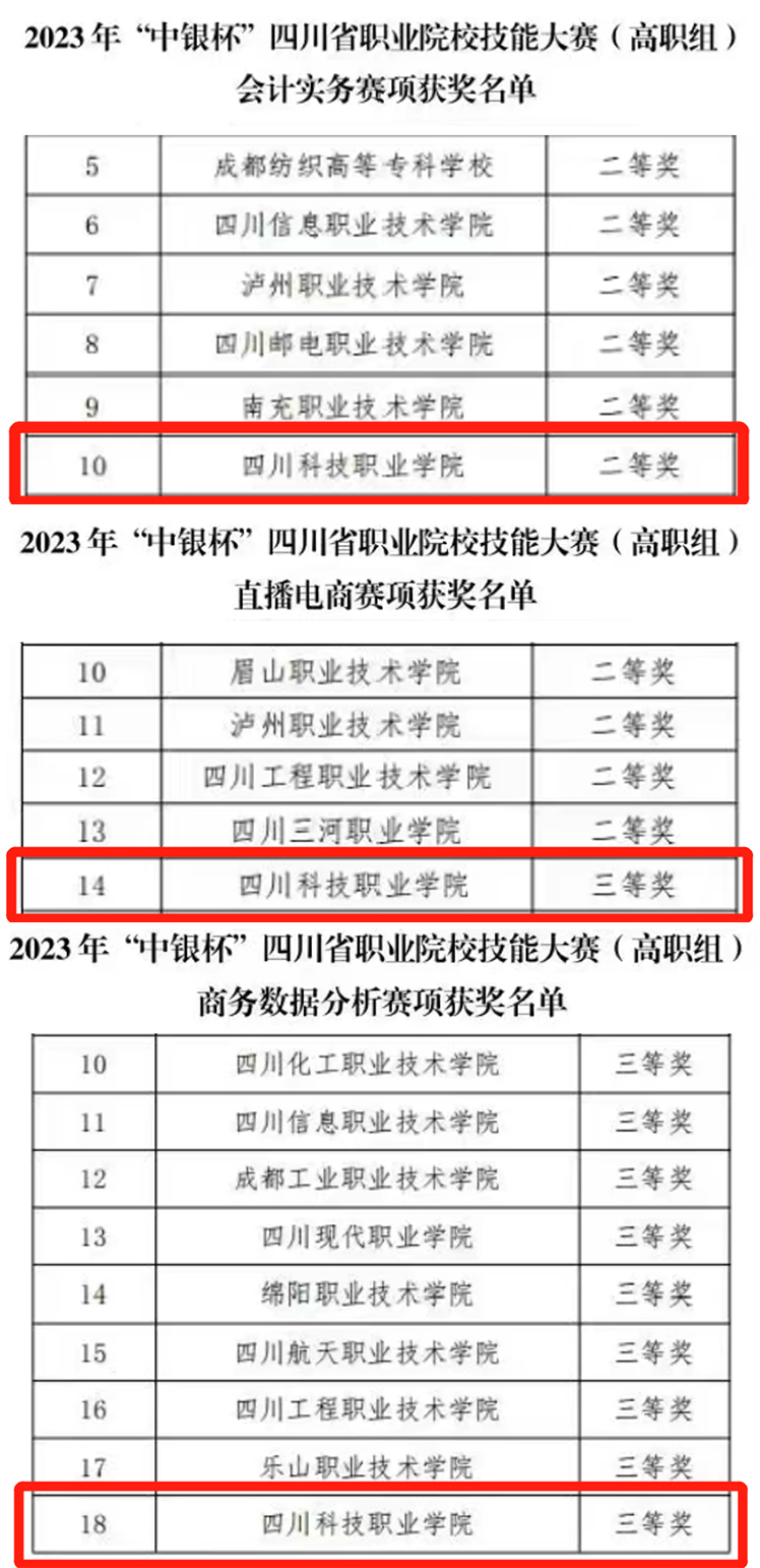 11月25日至26日,在四川省教育厅主办的2023 年“中银杯四川省职业院校技能大赛”中,我校新道云财经学院赖邹娅,陈柯霖,宋炜婷,贾颖老师组织的3支参赛团队分别在2023年“中银杯·四川省职业院校技能大赛”会计实务赛项获得省级二等奖;直播电商赛项,商务数据分析赛项获得省级三等奖!